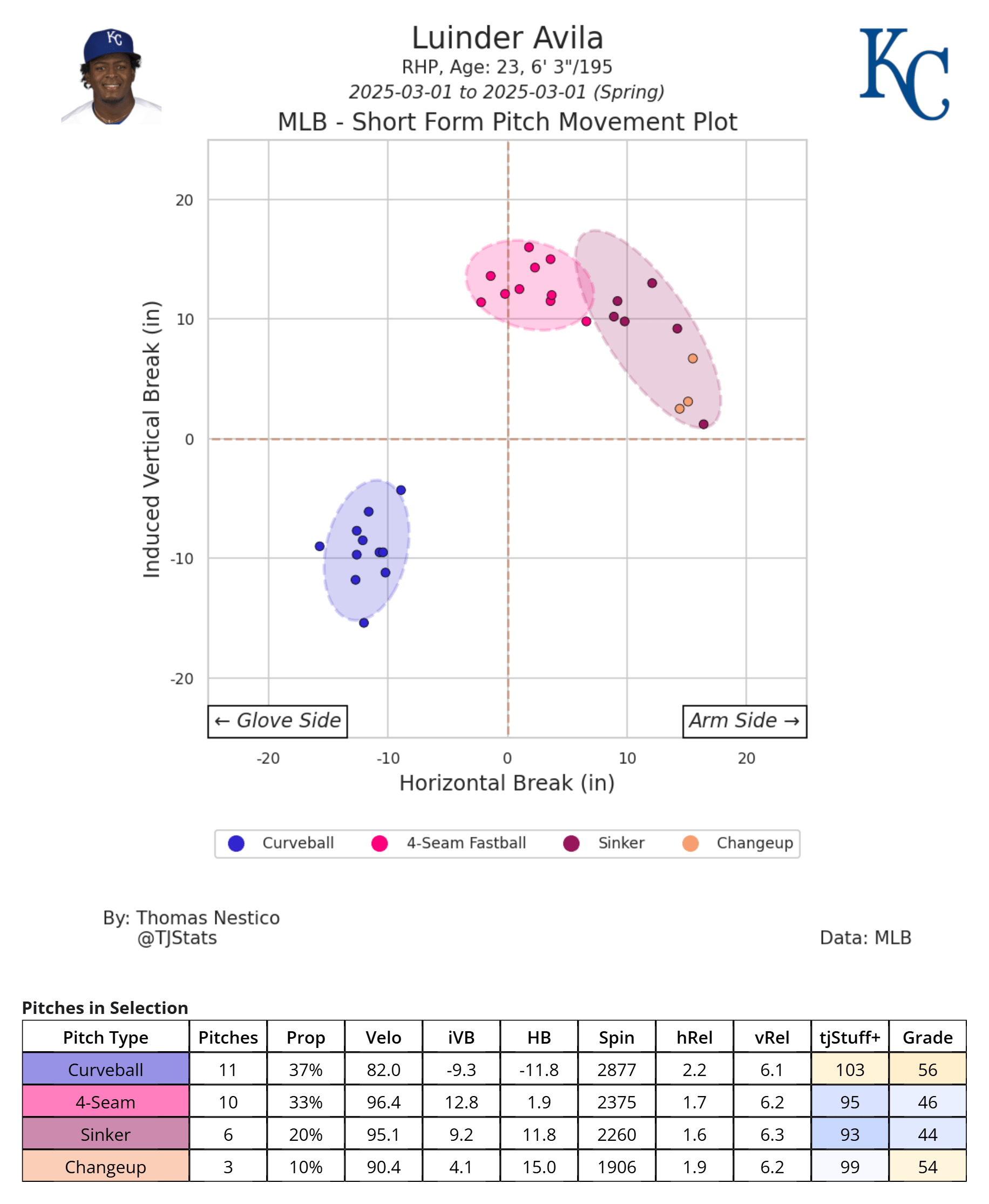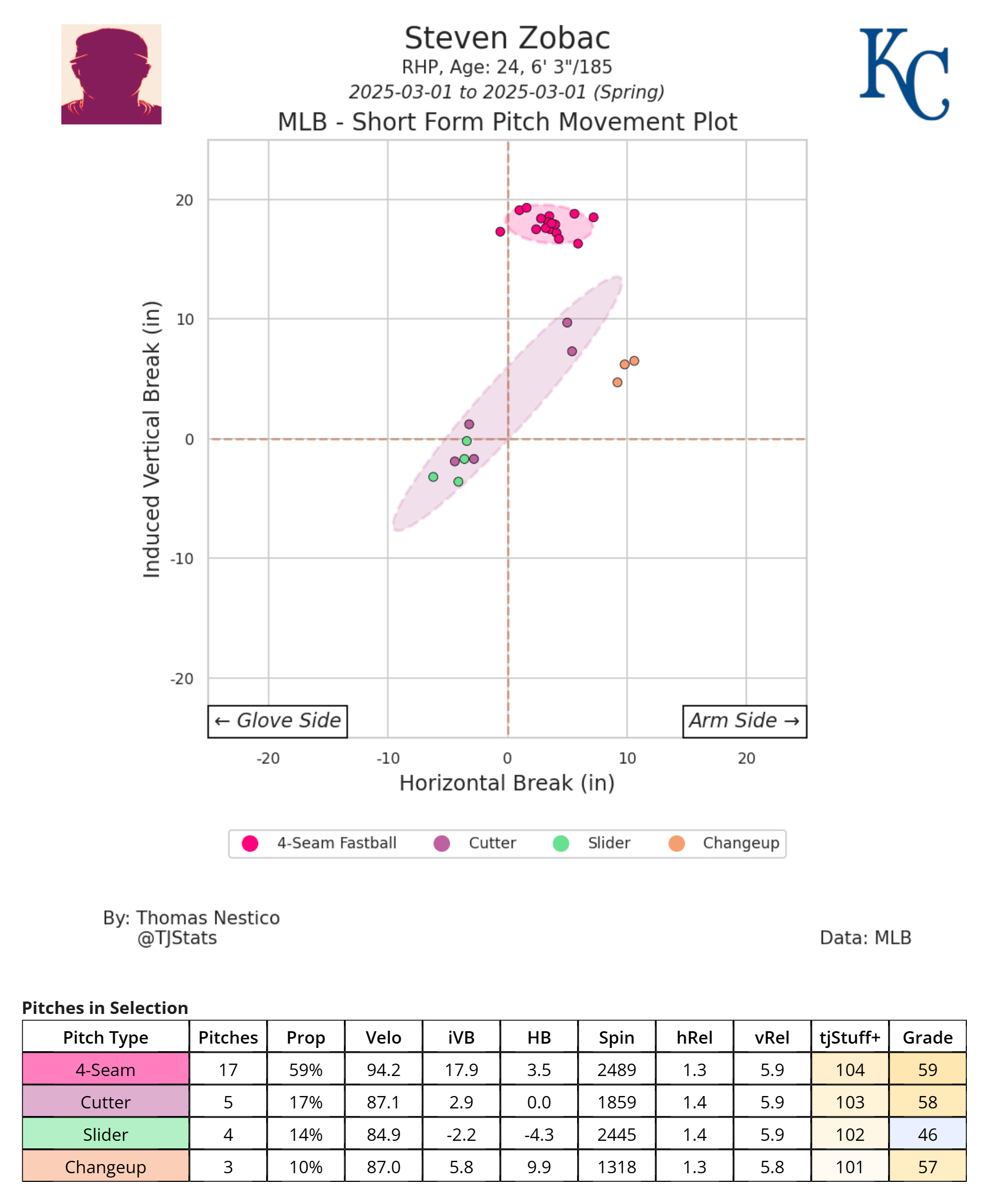 While results don’t matter as much, paying attention to stuff and trends in the pitch quality from Royals pitchers throughout the spring is still essential. These posts aim to identify which Royals pitchers this spring are showing progress or potential with their pitch quality and arsenal. That is why I only share the pitch plots from TJ Stats rather than the daily summaries, as the latter can tempt fans to focus a little too much on the results rather than the process.